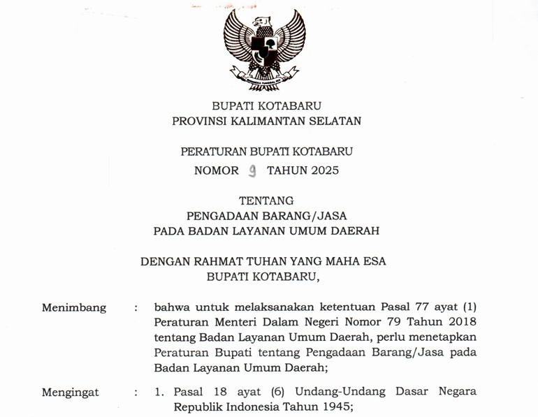 Peraturan Bupati Kotabaru Nomor 9 Tahun 2025 Tentang Pengadaan Barang Atau Jasa Pada Layanan Umum Daerah
