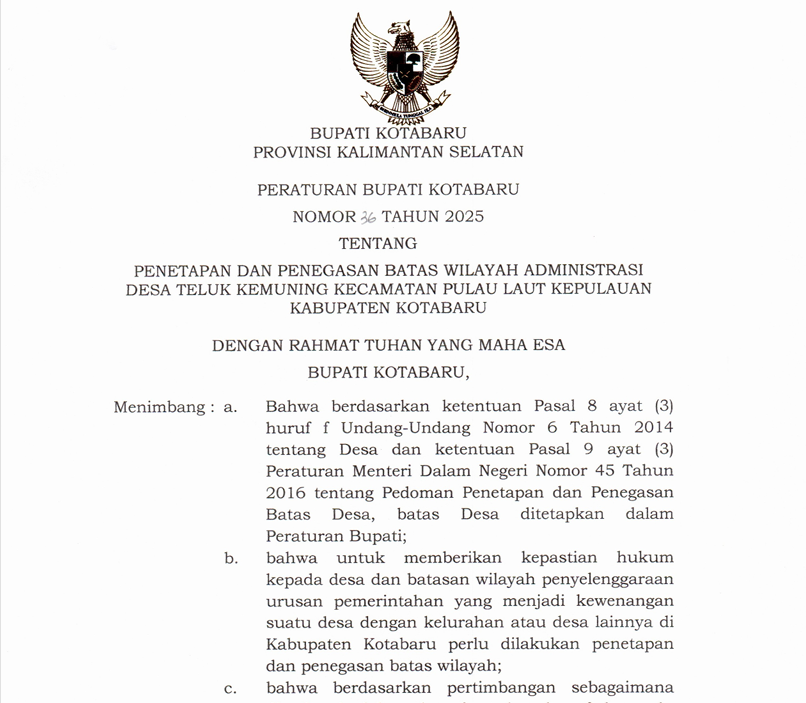 Peraturan Bupati Kabupaten Kotabaru Nomor 36 TAhun 2025 tentang Penetapan dan Penegasan Batas Wilayah Administrasi Desa Teluk Kemuning Kecamatan Pulau Laut Kepulauan Kabupaten Kotabaru