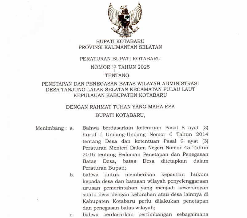 Peraturan Bupati Kabupaten Kotabaru Nomor 37 Tahun 2025 tentang Penetapan dan Penegasan Batas Wilayah Adminitrasi Desa Tanjung Lalak Selatan Kecamatan Pulau Laut Kepulauan Kabupaten Kotabaru