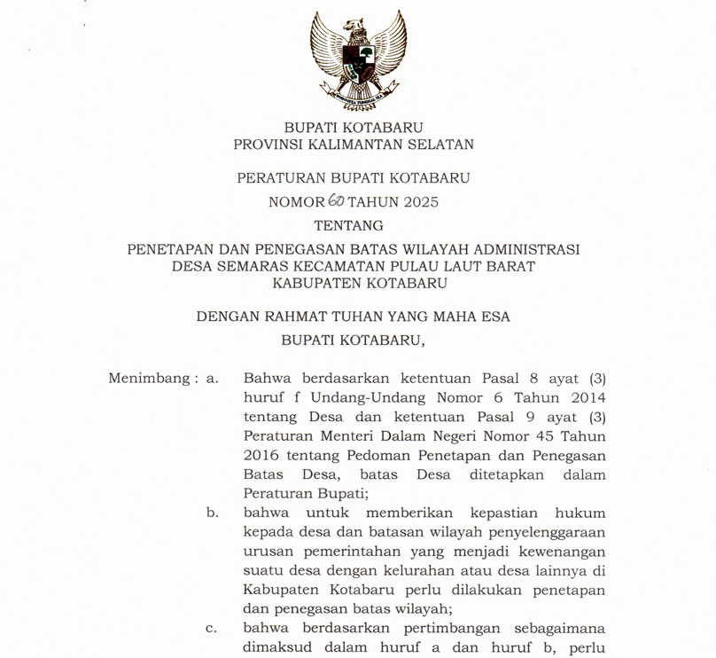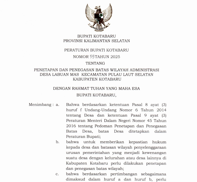 Peraturan Bupati Kotabaru Nomor 79 Tahun 2025 tentang Penetapan dan Penegasan Batas Wilayah Administrasi Desa Batuah Kecamatan Pamukan Barat Kabupaten Kotabaru