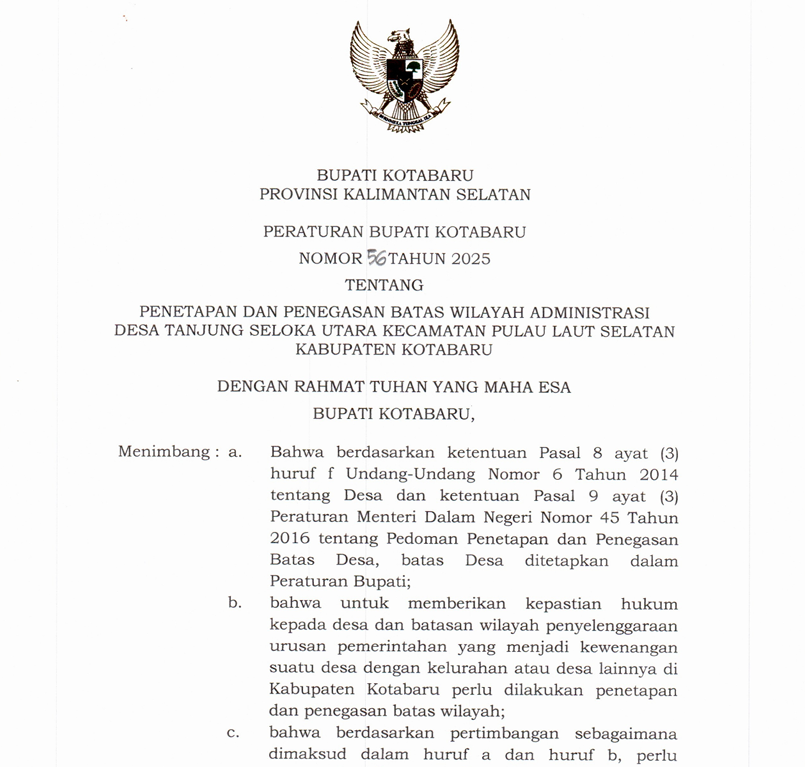Peraturan Bupati Kotabaru Nomor 56 Tahun 2025 tentang Penetapan dan Penegasan Batas Wilayah Administrasi Desa Tanjung Seloka Utara Kecamatan Pulau Laut Selatan Kabupaten Kotabaru
