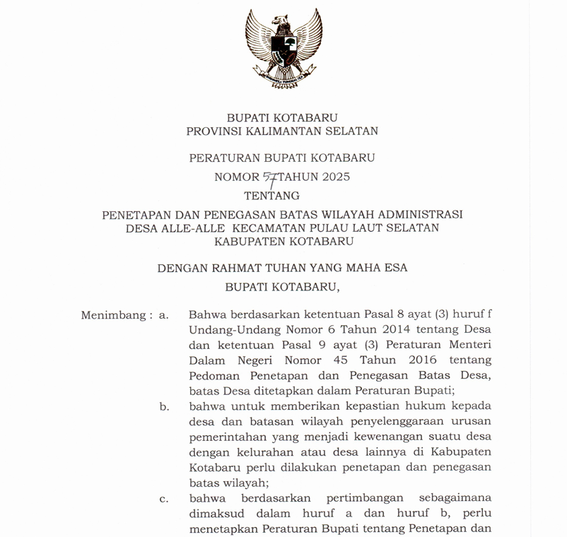 Peraturan Bupati Kotabaru Nomor 57 Tahun 2025 tentang Penetapan dan Penegasan Batas Wilayah Administrasi Desa Alle-Alle Kecamatan Pulau Laut Selatan Kabupaten Kotabaru