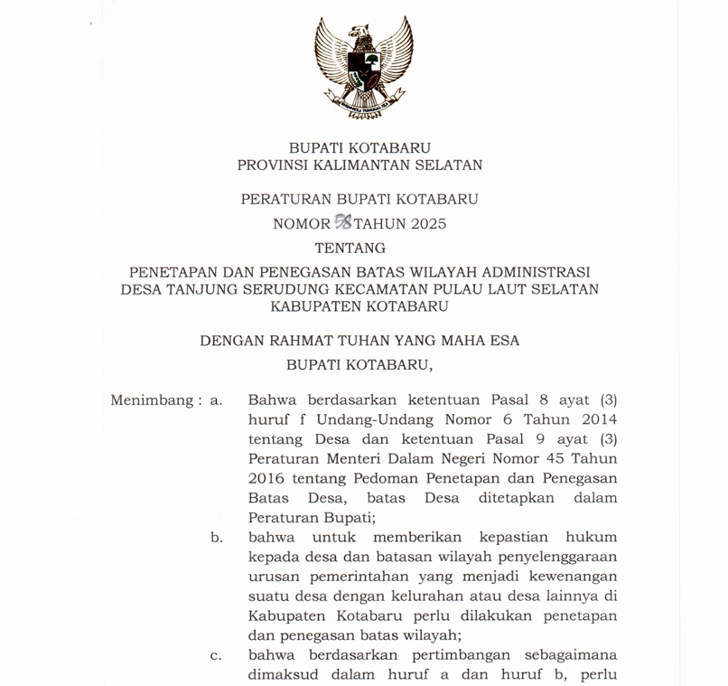 Peraturan Bupati Kotabaru Nomor 76 Tahun 2025 tentang Penetapan dan Penegasan Batas Wilayah Administrasi Desa Tanjung Pengharapan Kecamatan Pulau Laut Timur Kabupaten Kotabaru