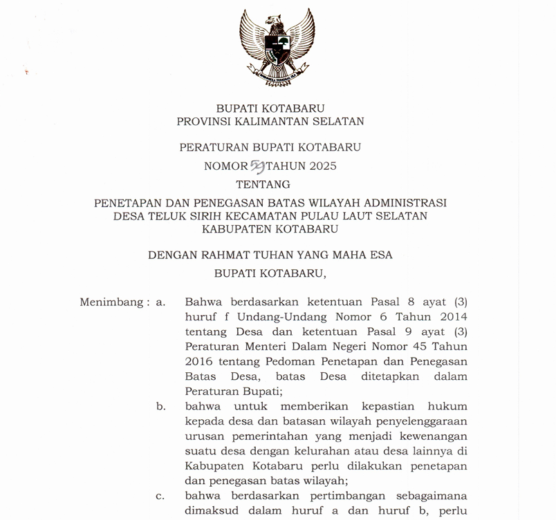 Peraturan Bupati Kotabaru Nomor 59 Tahun 2025 tentang Penetapan dan Penegasan Batas Wilayah Administrasi Desa Teluk Sirih Kecamatan Pulau Laut Selatan Kabupaten Kotabaru