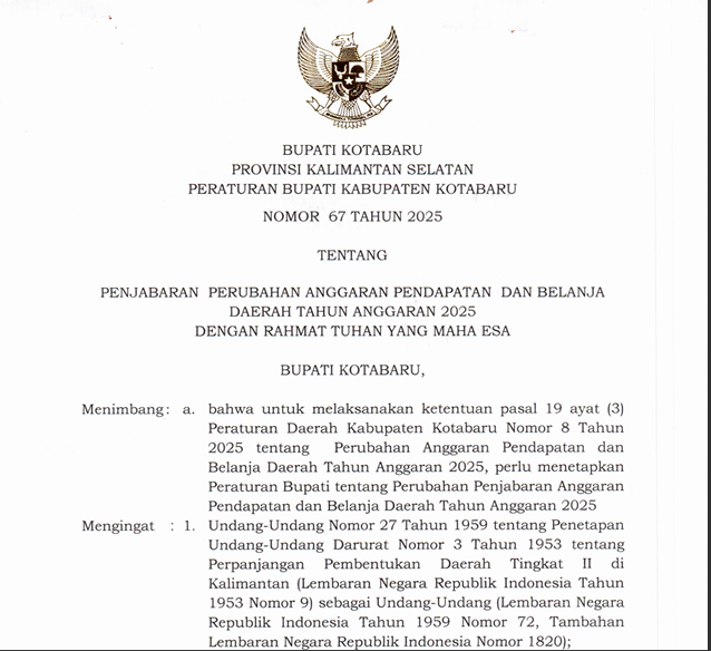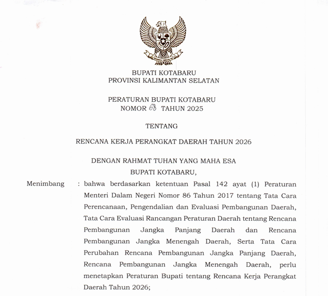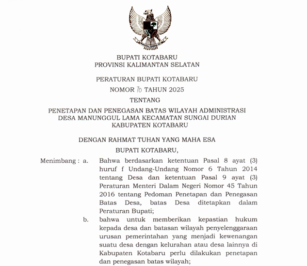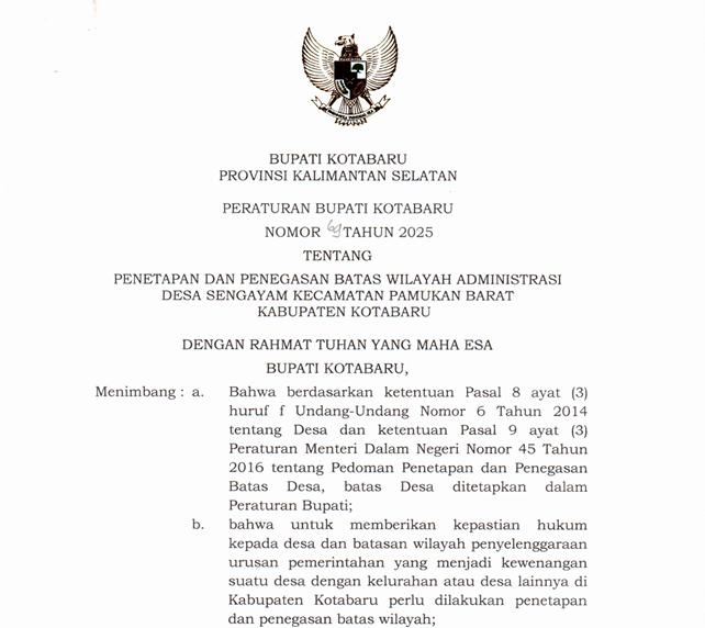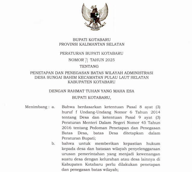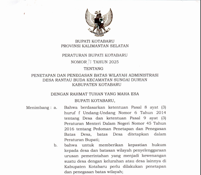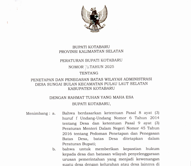 Peraturan Bupati Kotabaru Nomor 62 Tahun 2025 tentang Penetapan dan Penegasan Batas Wilayah Administrasi Desa Terangkih Kecamatan Pulau Laut Barat Kabupaten Kotabaru