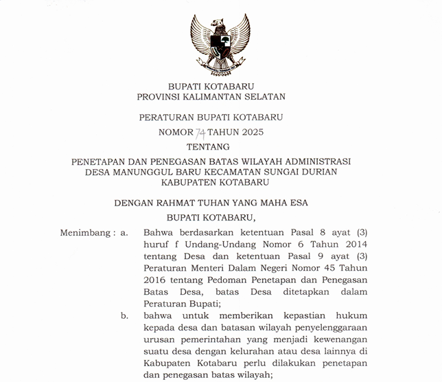 Peraturan Bupati Kotabaru Nomor 61 Tahun 2025 tentang Penetapan dan Penegasan Batas Wilayah Administrasi Desa Lontar Selatan Kecamatan Pulau Laut Barat Kabupaten Kotabaru