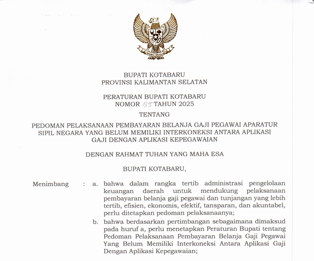Peraturan Bupati Kotabaru Nomor 85 Tahun 2025 tentang Pedoman Pelaksanaan Pembayaran Belanja Gaji Pegawai Aparatur Sipil Negara yang belum memiliki interkoneksi antara Aplikasi Gaji dengan Aplikasi Kepegawaian