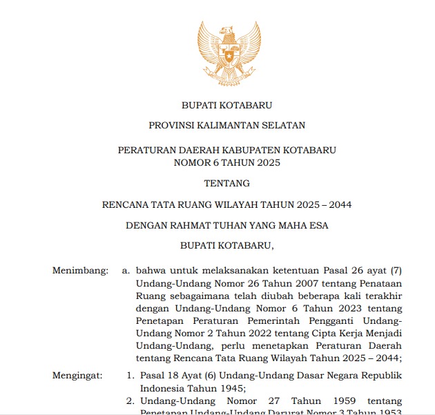 Peraturan Daerah Kabupaten Kotabaru Nomor 6 Tahun 2025 tentang Rencana Tata Ruang Wilayah Tahun 2025-2044