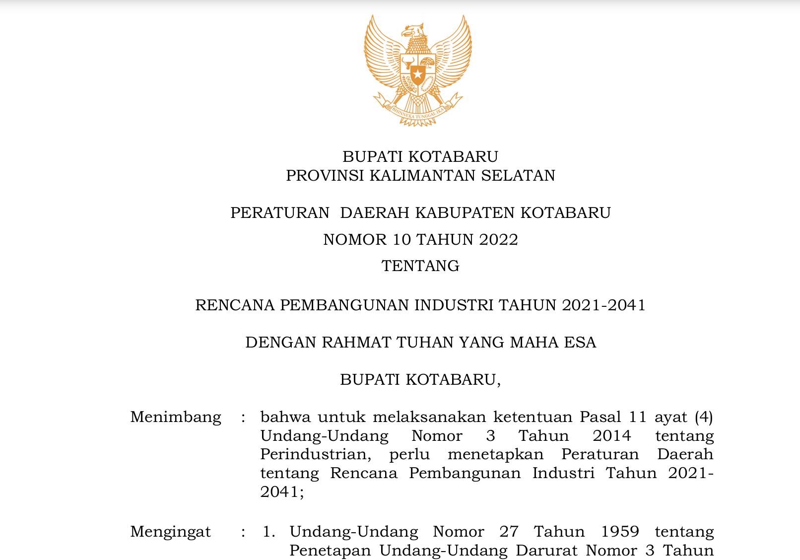 Peraturan Daerah Kabupaten Kotabaru Nomor 10 Tahun 2022 tentang Rencana Pembangunan Industri Tahun 2021-2041