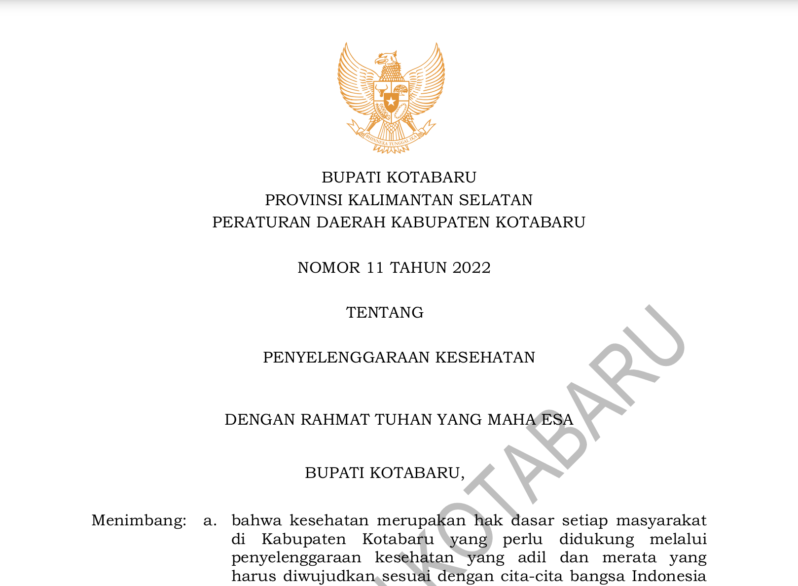 Peraturan Daerah Kabupaten Kotabaru Nomor 11 Tahun 2022 tentang Penyelenggaraan Kesehatan