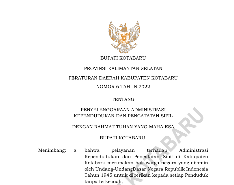 Peraturan Daerah Kabupaten Kotabaru Nomor 6 Tahun 2022 tentang Penyelenggaraan Administrasi Kependudukan dan Pencatatan Sipil