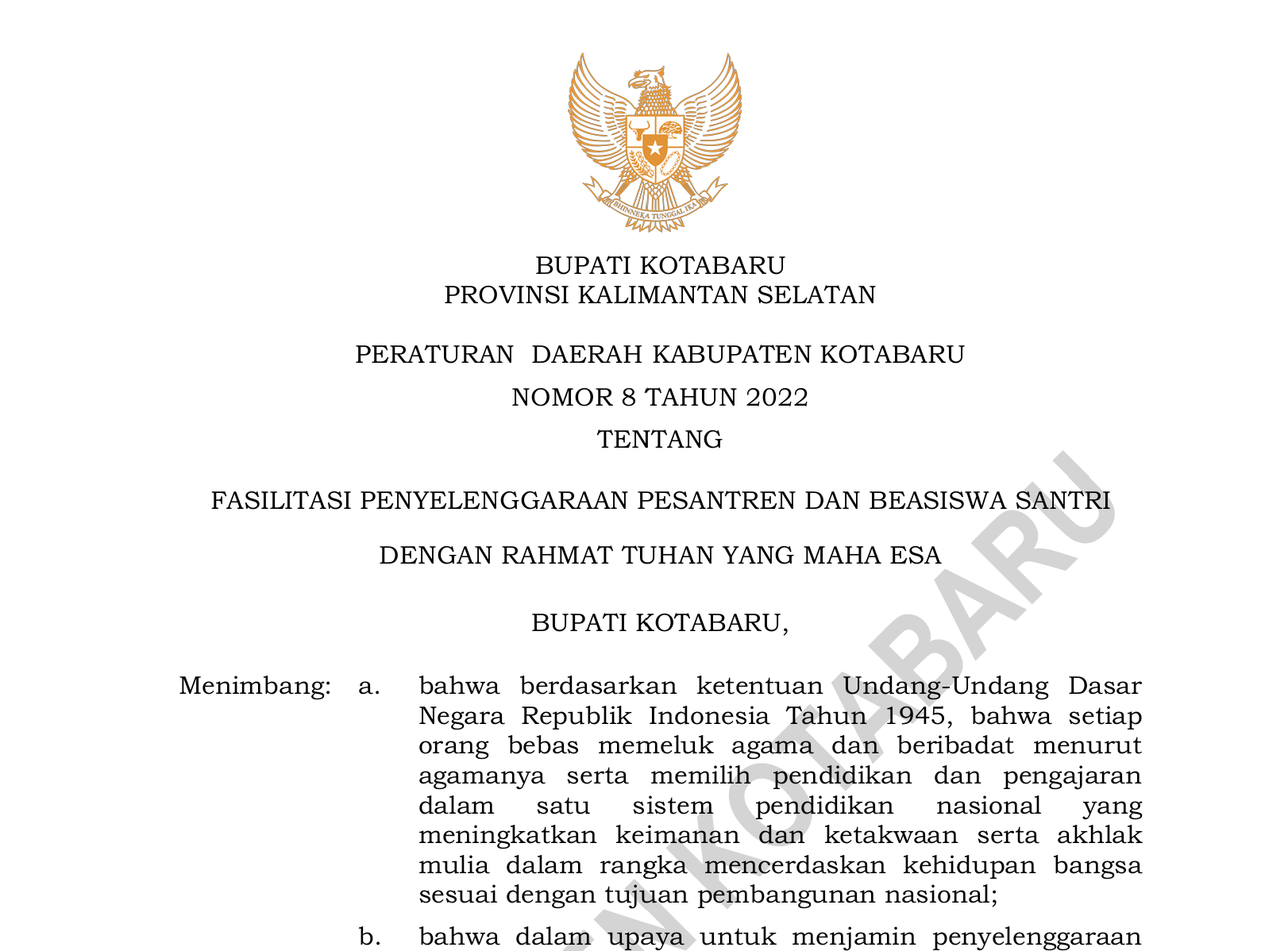 Peraturan Daerah Kabupaten Kotabaru Nomor 8 Tahun 2022 tentang Fasilitasi Penyelenggaraan Pesantren dan Beasiswa Santri