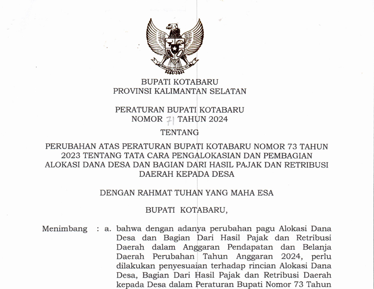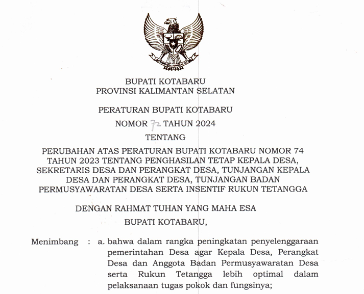 Peraturan Bupati Kabupaten Kotabaru Nomor 72 Tahun 2024 tentang Perubahan Atas Peraturan Bupati Kotabaru Nomor 74 Tahun 2023 tentang Penghasilan Tetap Kepala Desa, Sekretaris Desa dan Perangkat Desa, Tunjangan Kepala Desa dan Perangkat Desa, Tunjangan Badan Permusyawaratan Desa serta Insentif Rukun Tetangga